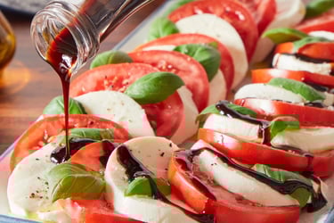 Mozzarella cheese, Roma Tomatoes, Basil, Olive Oil, Salt and Pepper with Balsamic glase